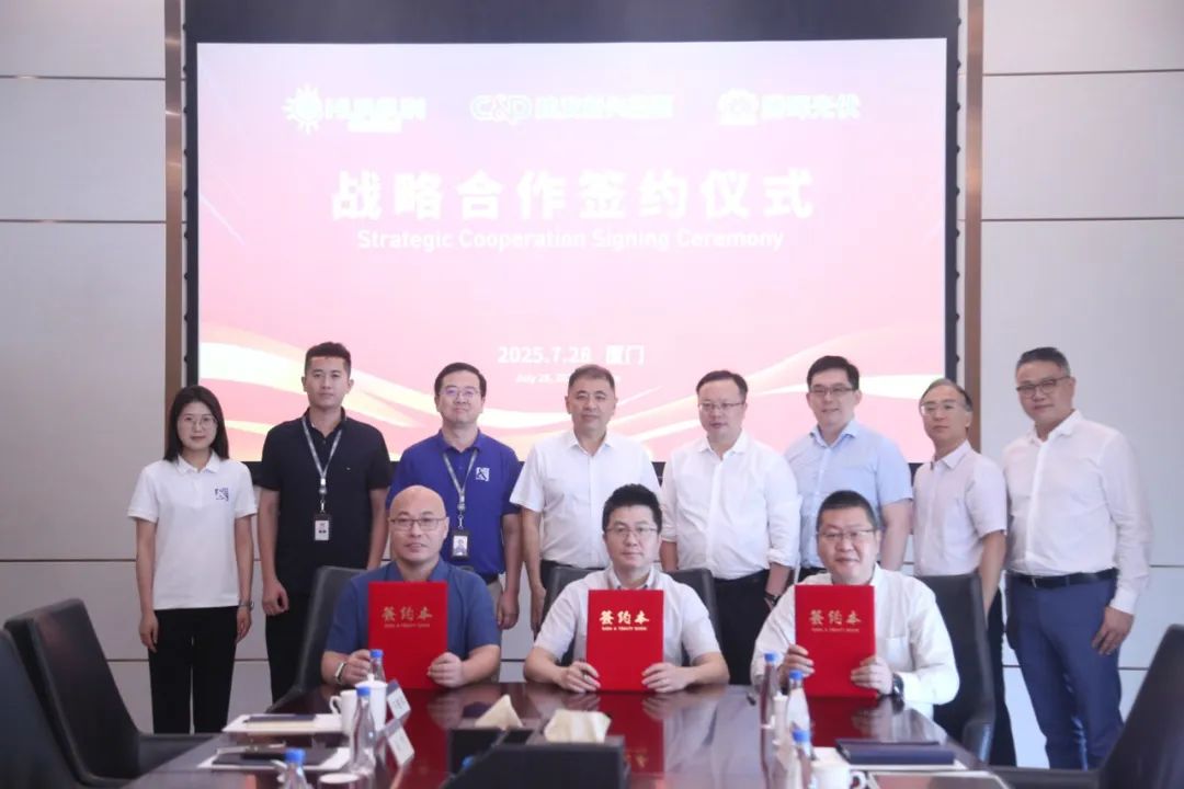 2025年7月28日,廈門建發(fā)新興能源有限公司(以下簡稱“建發(fā)新興能源”)、蘇州騰暉光伏技術(shù)有限公司(以下簡稱“騰暉光伏”)與安徽華晟新能源科技股份有限公司(以下簡稱“華晟新能源”)在廈門建發(fā)集團(tuán)總部簽署三方戰(zhàn)略合作協(xié)議。此次合作的核心在于引入華晟新能源先進(jìn)的異質(zhì)結(jié)(HJT)技術(shù)這一“新質(zhì)生產(chǎn)力”,旨在顯著提升騰暉光伏的技術(shù)實(shí)力與產(chǎn)品競爭力,實(shí)現(xiàn)關(guān)鍵突破。廈門建發(fā)股份有限公司(以下簡稱“建發(fā)股份”)副總經(jīng)理、中利集團(tuán)股份有限公司(以下簡稱“中利集團(tuán)”)董事長許加納、建發(fā)新興能源總經(jīng)理、騰暉光伏董事長黃昶、華晟新能源副總裁梁海彬分別代表三方簽署協(xié)議。建發(fā)股份董事長林茂、華晟新能源董事長徐曉華等領(lǐng)導(dǎo)共同見證簽約。