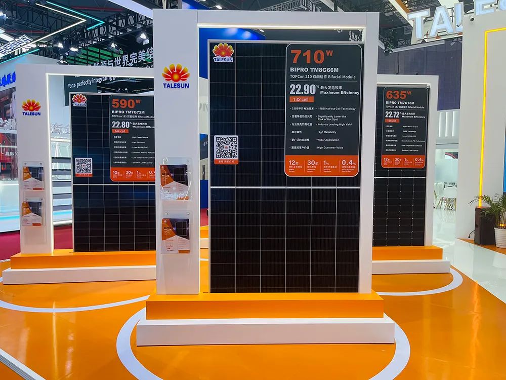 Since it?was founded, Talesun has hammered at promoting the progress and application of photovoltaic technologies. At SNEC 2024, Talesun displayed all its TOPCon modules,?which were hailed for their superior power and efficiency, and rich product line of modules of various power and sizes.?They are not only suitable for large ground-based power stations, but also for the industrial,?commercial and household PV markets.?Notably,?the maximum power of the TM8G66 module reaches?710W, and its conversion efficiency amounts to 22.9%, rated among the highest in the industry. In addition, Talesun has also provided?customized solutions for different application scenarios to meet the diverse needs of customers.