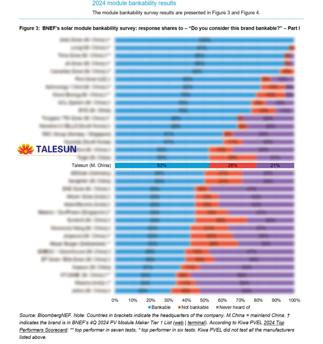 Recently, BloombergNEF (BNEF), a globally renowned research institution, released its 2024 PV Module and Inverter Bankability Report. Talesun Solar achieved a top ranking due to its strong financial stability and solid corporate credibility. This authoritative certification not only reaffirms the reliability of Talesun’s products and brand value but also establishes its modules as a benchmark for “l(fā)ow-risk, high-value” green assets in the eyes of global financial institutions and investors.